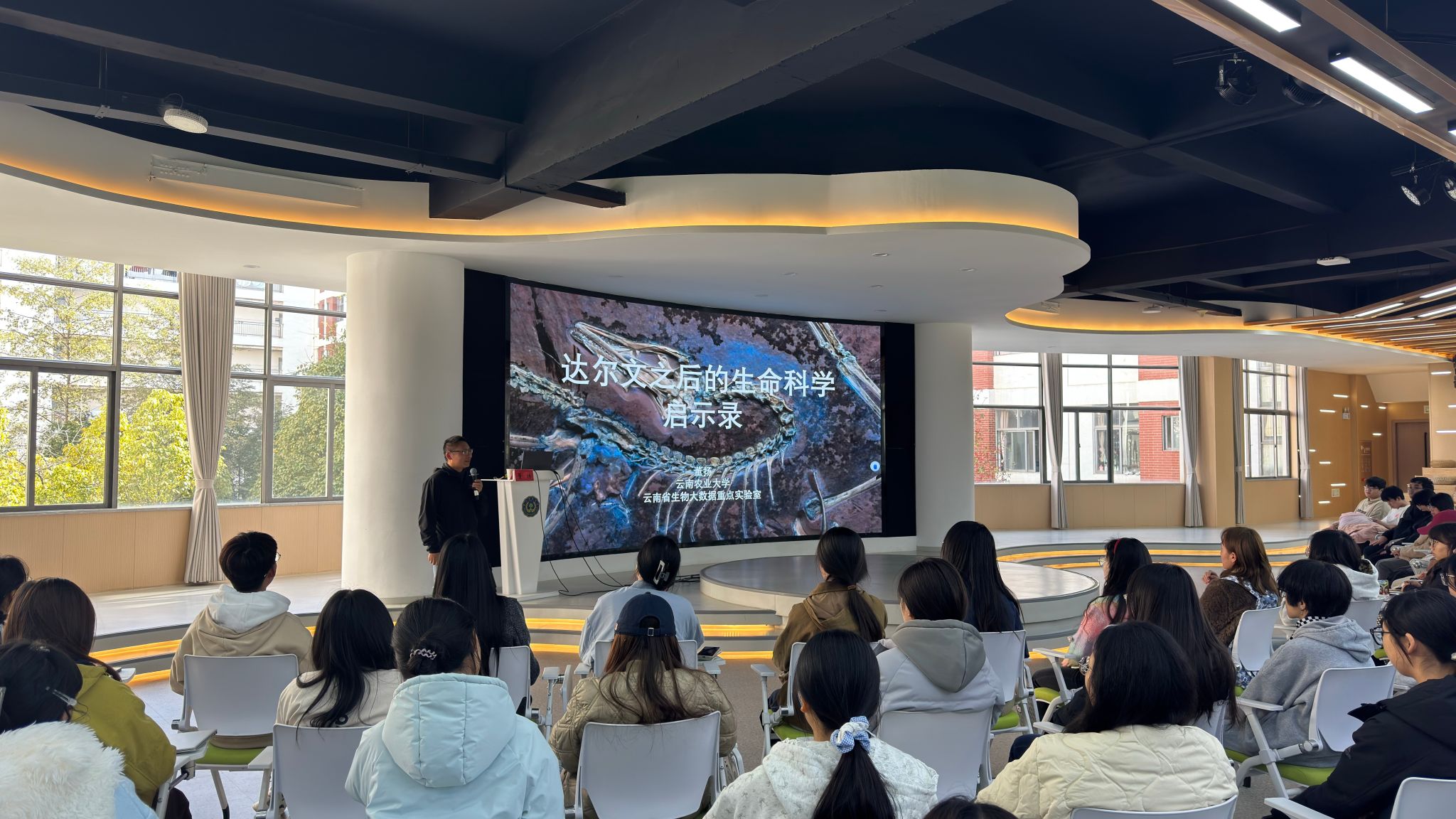 本站消息 11月26日,由学校学生处(学生中心)举办的第一期“问耕未来·学术大讲堂”在“一站式学生社区”共享交流厅举行。本次讲座特邀董扬教授作为主讲嘉宾,以“达尔文之后的生命科学启示录”为主题与近百名学子进行交流。