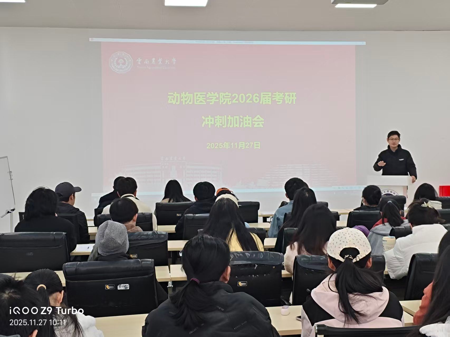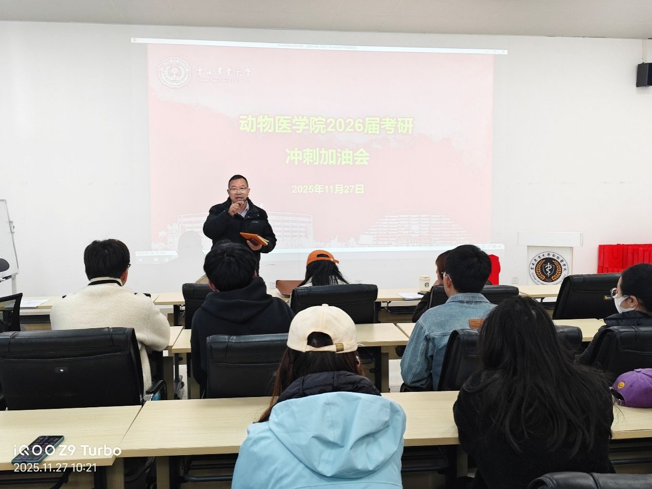 本站消息 为鼓舞考研学子锚定目标,笃行不怠,动物医学院于11月27日上午在实验楼209举办“乘风破浪,砺志研思”考研加油会。学院党委副书记赵汝、副院长李鸿辉、组织员李兴奎及全体辅导员出席活动。