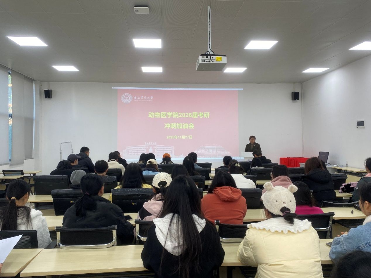 本站消息 为鼓舞考研学子锚定目标,笃行不怠,动物医学院于11月27日上午在实验楼209举办“乘风破浪,砺志研思”考研加油会。学院党委副书记赵汝、副院长李鸿辉、组织员李兴奎及全体辅导员出席活动。
